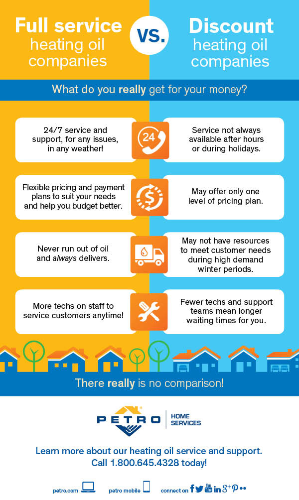 - Full-service suppliers seldom “run out” of heating oil. Discount companies may not always be able to deliver based on supply and demand. On the other hand, in the over 100 year history of Petro Home Services we’ve never run out of