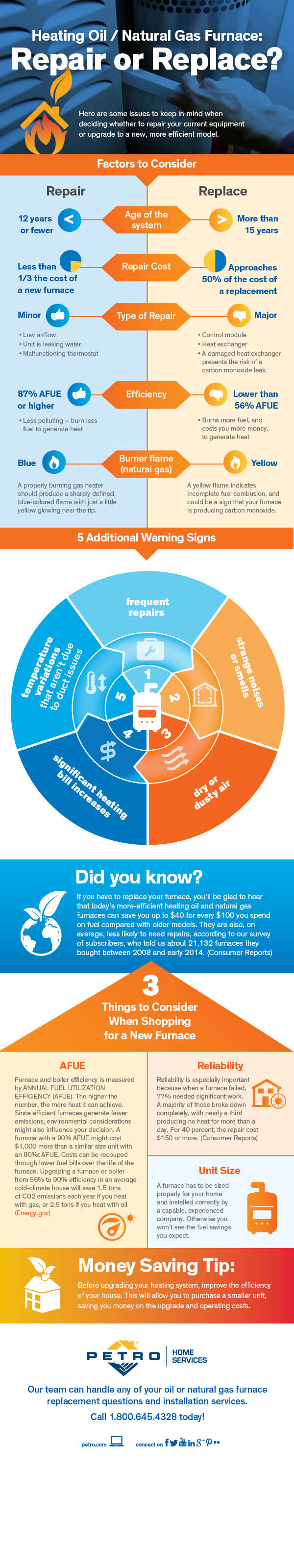 Replace: If your furnace system is more than 15 years old and requires a costly repair to maintain efficiency.