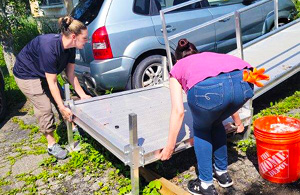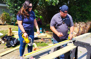 Once that project was completed, the crew built and installed new stairs in the Habitat for Humanity home. Everyone also had fun putting in a ramp for the new homeowner’s dog, who has an aversion to stairs! In addition to the carpentry and installation, the team also tackled landscaping, by mowing, weed whacking, pruning, trimming and raking the yard as it was significantly overgrown in front of the home.